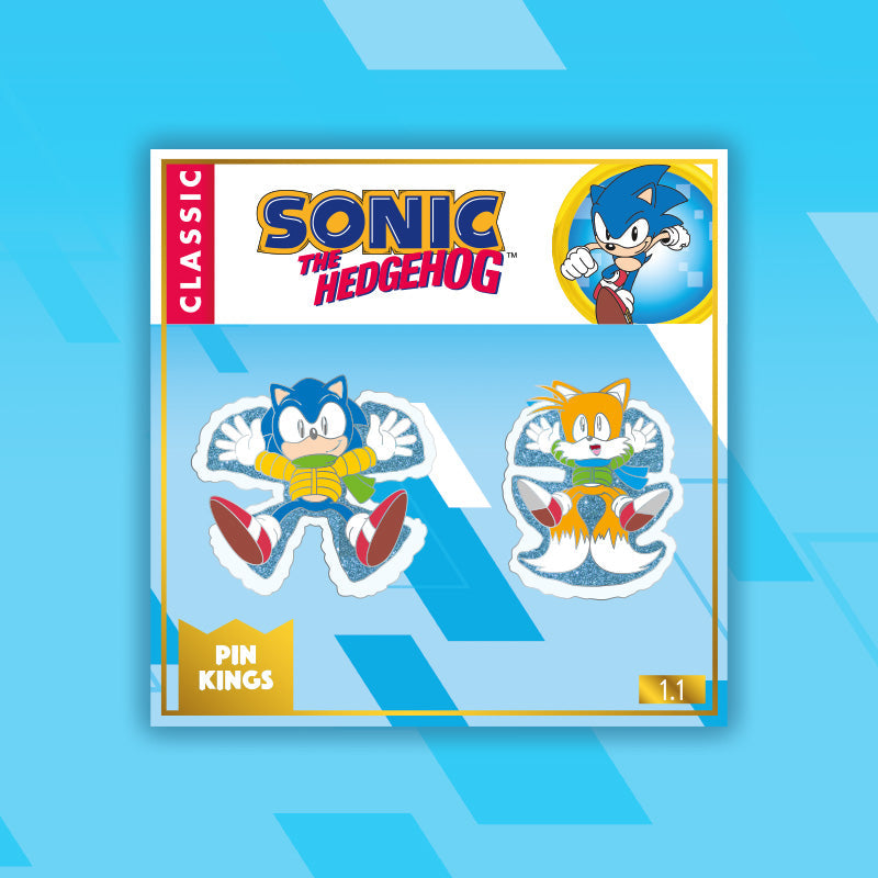 Two premium quality metal pins with a glossy finish featuring Snow Angel Sonic and Snow Angel Tails.