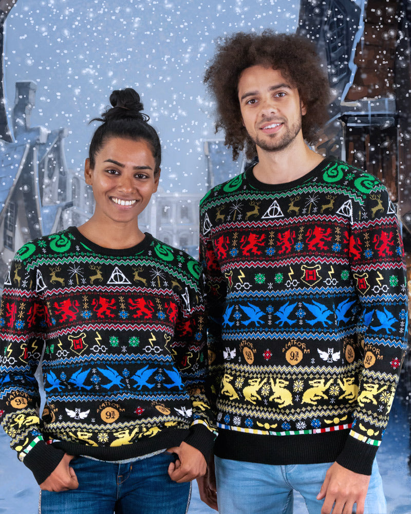 Add a little magic to your Christmas by sporting this 100% knitted Harry Potter themed winter garment. From Slytherin with their cunning ambition and pride to Gryffindor with their bravery and determination, this high-quality jumper features all four Hogwarts house emblems as well as a bunch of iconic Harry Potter references! This is a must-have item for any Harry Potter enthusiast looking to spruce up their wardrobe for the holiday season.