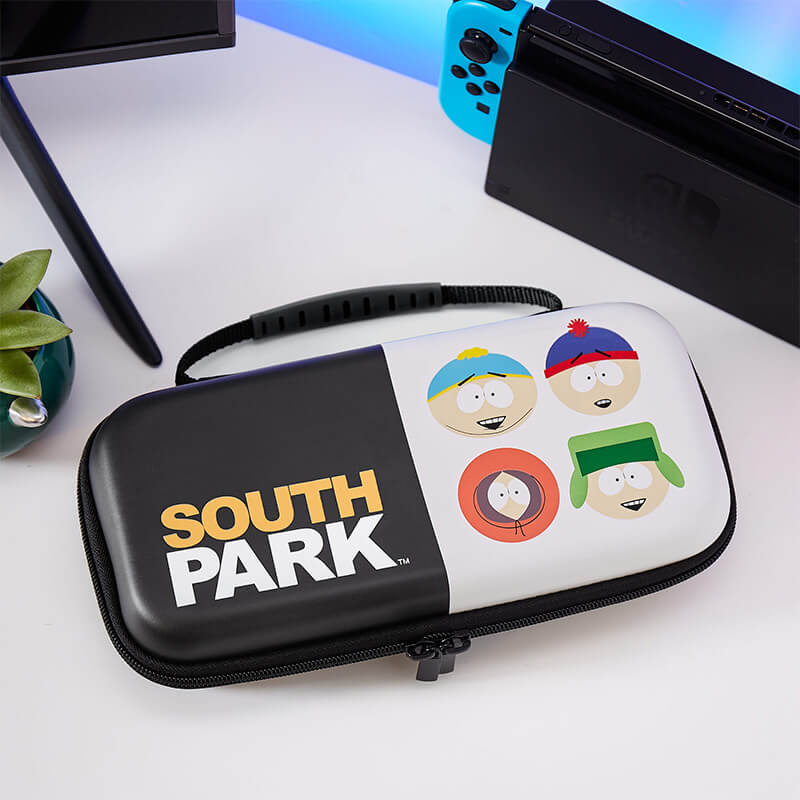 Come on down to South Park and protect your Switch with this official case! The hard outer shell offers protection from bumps and scrapes with a design featuring Kyle, Stan, Cartman and Kenny alongside the South Park logo. The case boasts a soft inner lining with storage for up to 10 game cartridges, as well as space for thumb grips and cables.